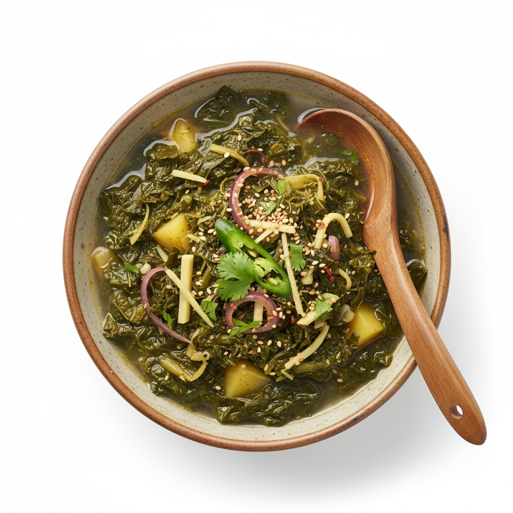 Gundruk is a traditional fermented leafy green dish from Nepal, also enjoyed in parts of Sikkim and Darjeeling. It is made by fermenting mustard, radish, or cauliflower leaves, which are then sun-dried and stored. Historically, this technique was a way to preserve vegetables for harsh winters in the Himalayas. Gundruk soup is prized for its tangy flavor, probiotic benefits, and role as a warming, gut-friendly dish in cold climates.